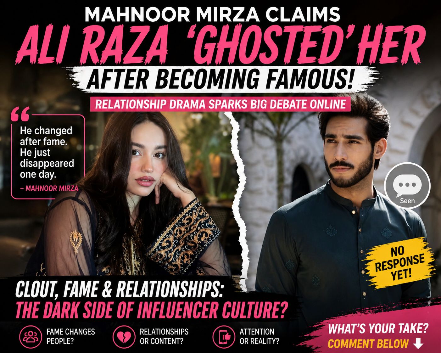 Influencer Mahnoor Mirza recently went viral after claiming that actor Ali Raza “ghosted” her after gaining fame. Her statement quickly sparked widespread discussion on social media about how success can impact personal relationships. Many users supported her, saying fame often changes people, while others believed such private matters should not be shared publicly. The controversy highlights how influencer culture often mixes real emotions with online attention. It also raises questions about whether these situations are genuine or sometimes amplified for engagement.