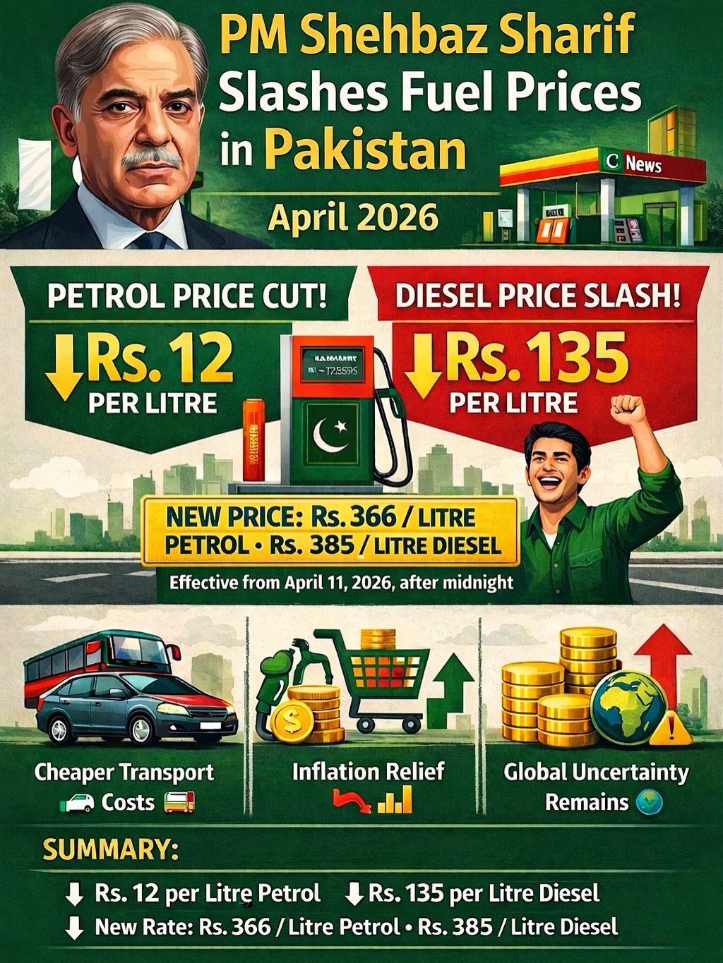 Prime Minister Shehbaz Sharif has announced a reduction in petroleum prices, providing relief to the public. Petrol prices have been decreased by Rs. 12 per litre, while diesel has seen a significant cut of Rs. 135 per litre. The new rates are approximately Rs. 366 per litre for petrol and Rs. 385 per litre for diesel. These prices came into effect from April 11, 2026, after midnight. The reduction comes amid a slight drop in global oil prices and increasing public pressure. It is expected to help lower transportation costs and provide some relief from inflation.